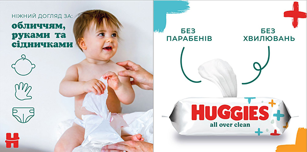 Вологі серветки Huggies All Over Clean забезпечують ніжний догляд за обличчям, руками і сідничками малюка: