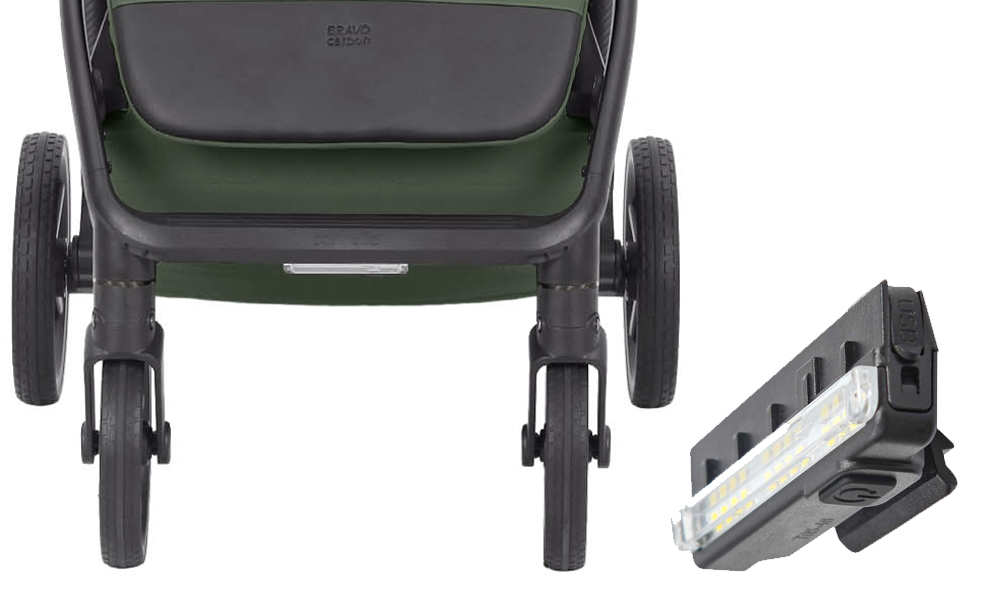 Безпеку та комфорт дитини забезпечують п’ятиточкові ремені (у кольорах Extreme Grey та Marlin Blue вони мають магнітні застібки), поворотний бампер, обмежувач від зісковзування та LED-ліхтар. Доступні 3 режими світла: яскравий, середній і миготливий (заряджається за допомогою USB-кабелю). Зручні п'ятиточкові ремені безпеки.