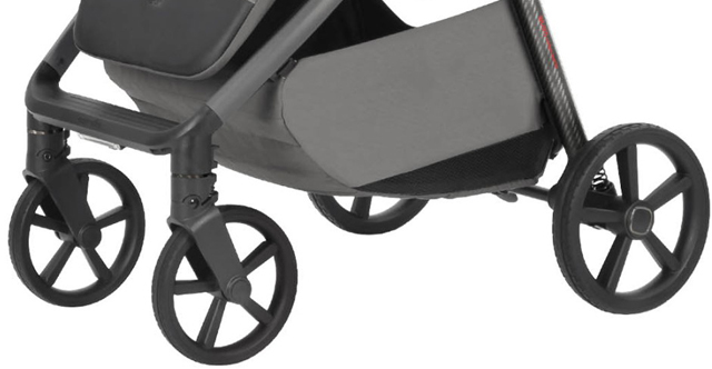 Великі непробивні колеса з пружинною амортизацією на кожному з них - для зручного пересування по різних поверхнях. Передні колеса фіксуються в положенні прямо для більшої прохідності на бездоріжжі. Позаду - зречне ножне гальмо.